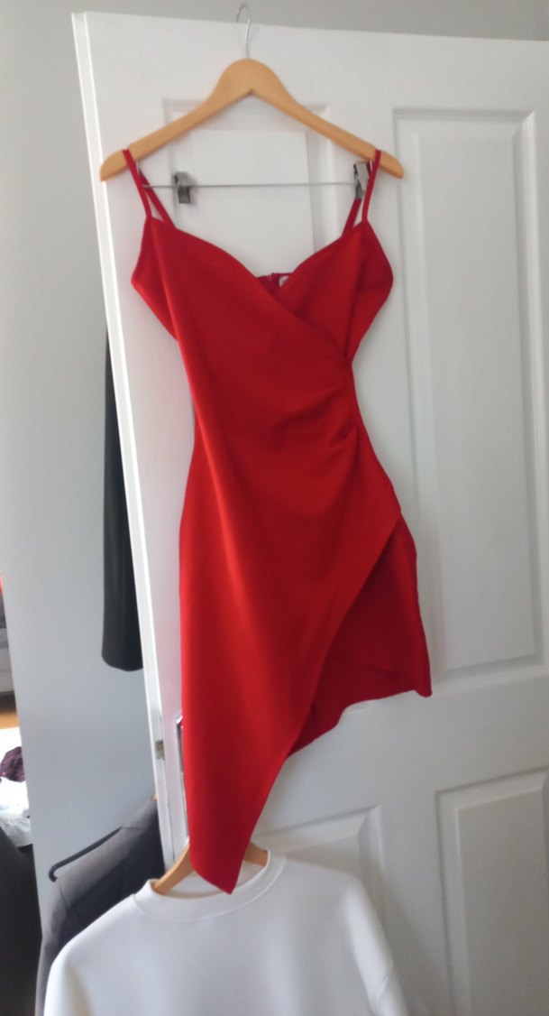 kırmızı renkte, drapeli ve V yaka midi uzunluğunda, askılı ve vücuda oturan abiye elbise. Romantik akşamlar için minimal ve çağdaş tasarım. ❤️
