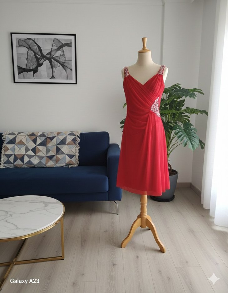Kırmızı Drapeli Midi Abiye Elbise
