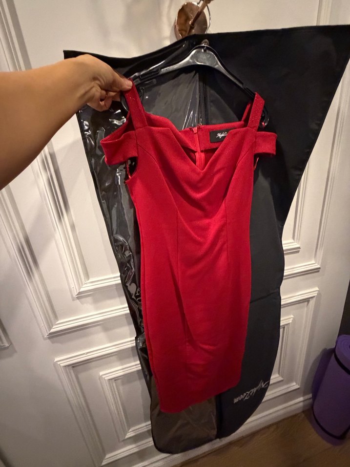 Kırmızı, drapeli ve omuzları açık midi boy elbise. Sıkı kesimi ve baskılı kumaşıyla cesur romantik akşamlar için ideal. Kollu değil.Sadece 2 kez düğün ve nişana giyildi.