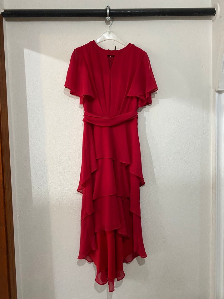 Kırmızı, drapeli katmanlara sahip midi, bol kesim elbise. V yaka ve kısa kolludur, düğünler için uygundur. Minimalist şıklık sunar. Arkası ön tarafa göre biraz uzun.