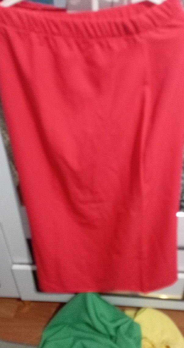 Kırmızı, drapeli, parlak görünümlü, normal boy midi hamile eteği. Minimalist tarzda, günlük kullanıma uygun.