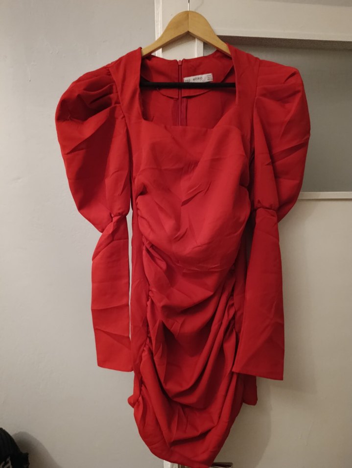 Kırmızı, drapeli detaylara sahip, V yaka ve askılı kollu, midi boy sıkı kesim kadın abiye elbise. Romantik akşamlar için uygun, çağdaş tarzda.