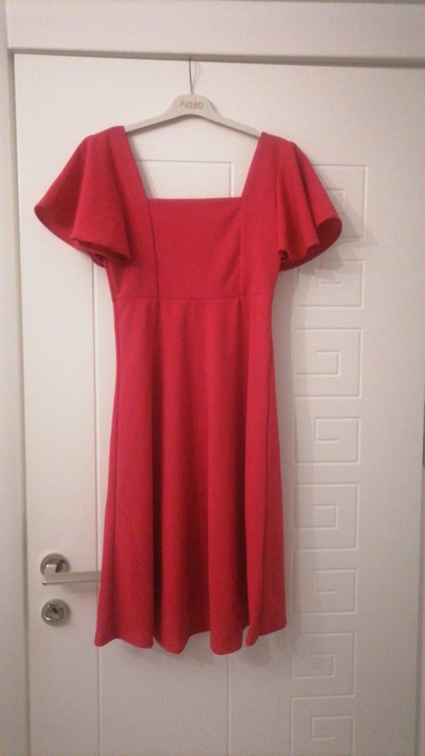 Kırmızı, drapeli, kısa kollu ve tek renk midi elbise, tekne yaka ve klasik modern tarzıyla romantik akşamlar için uygundur. ❤️