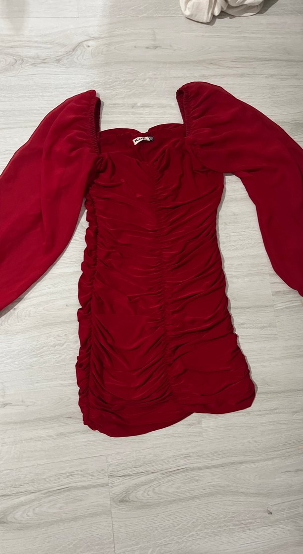 Drapeli detaylara sahip, uzun kollu ve V yakalı kırmızı, vücuda oturan midi elbise, cesur ve göz alıcı bir görünüm sunar.