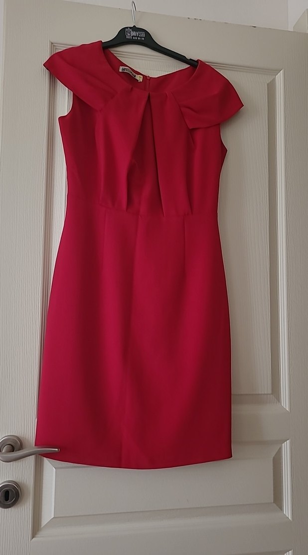 Kolsuz, V yaka, drapeli detaylı kırmızı midi elbise, parlak dokusuyla modern klasik tarz sunar. Ofis için uygundur.