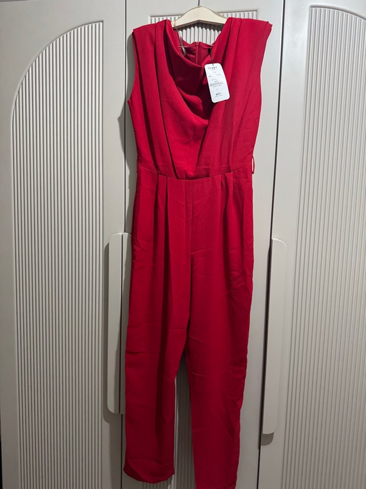 Kırmızı renkte, drapeli detaylara sahip vatkalı, fitted tulum. Sentetik kumaştan, ofis ve sokak stiline uygun, minimal ve şık tasarım. Kolsuz.
