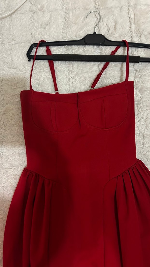 Bu kırmızı drapeli mini abiye elbise, ince askılar ve straplez yakaya sahip, modern klasik tarzıyla romantik akşamlar için uygundur. ❤️ Sadece bir kere giyildi