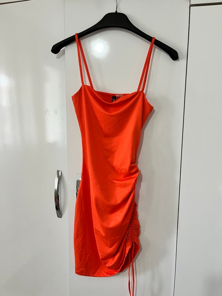 Bu kırmızı parlak mini elbise, drapeli detayları ve ince askılarıyla cesur, minimalist stil için uygundur.