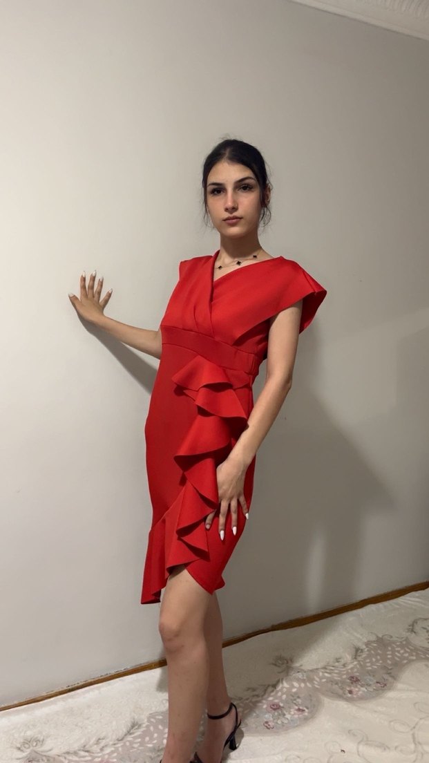 Kırmızı Drapeli Mini Abiye Elbise