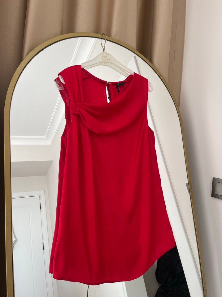Kırmızı, askısız ve drapeli yakaya sahip bu bluz, rahat kesimi ve kısa boyuyla minimalist tarzda gündelik kullanıma uygundur.