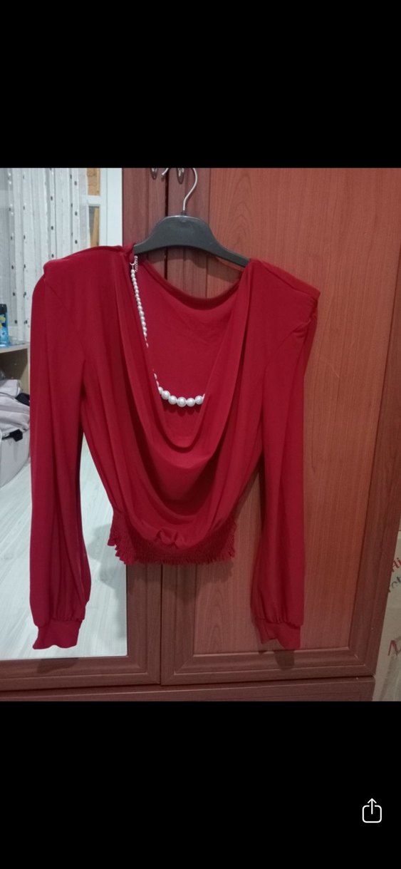 Kırmızı, drapeli kısa ve dar kesim bluz. Yüksek yakalı, uzun kollu ve parlak, ipeksi dokulu, trend sokak stili için uygun.