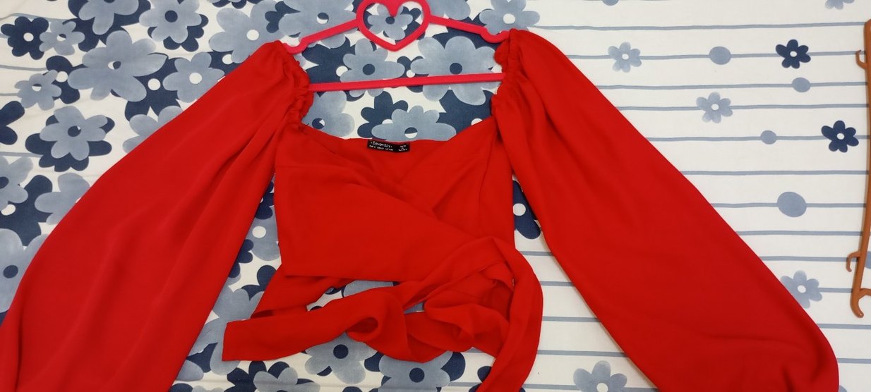 Kırmızı renkte, tek parça sentetik kumaştan yapılmış, drapeli ve kısa kesim mini bluz. Kayık yaka ve askılı kollara sahip, cesur sokak modasına uygun.