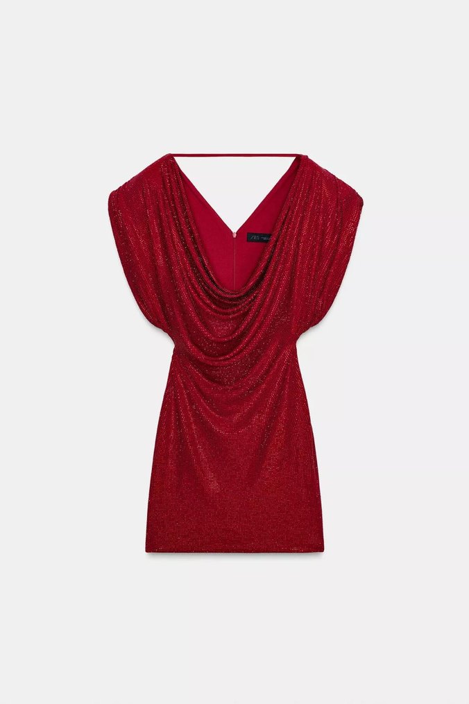 Parlak kırmızı sentetik kumaştan, drapeli V yakalı, kısa ve dar kesim elbise. Gösterişli ve çağdaş tarzda, kolsuz parti elbisesi. ✨