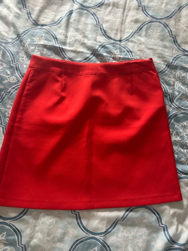 Drapeli ve parlak kırmızı renkte, düz ve dar kesim mini etek. Sentetik kumaştan, romantik akşamlar için uygun.
