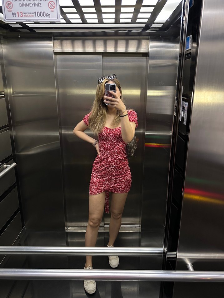 Sentetik kumaştan üretilmiş, V yakalı, drapeli ve askılı kolları olan kırmızı bağlama desenli mini, fitted günlük elbise. Romantik akşamlar için uygun.