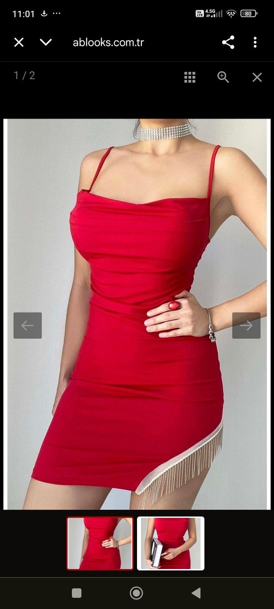 İnce askılı, drapeli V yakalı kırmızı mini elbise. Parlak sentetik kumaş ve püskül detaylarıyla şık ve modern parti tarzı sunar.