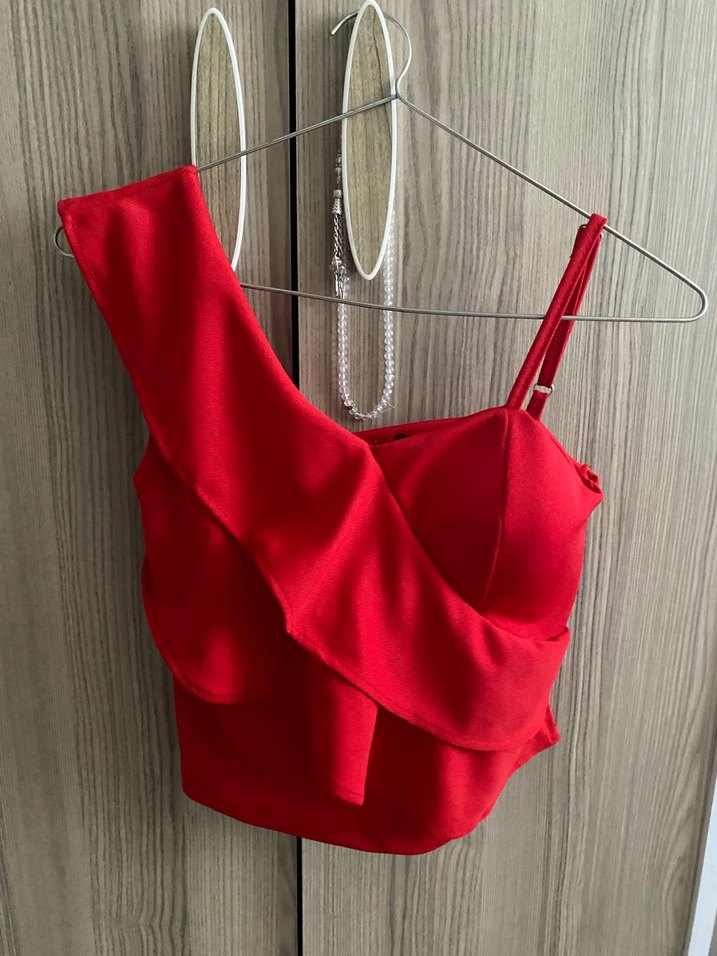 Kırmızı, tek askılı ve drapeli detaylı, vücuda oturan straplez mini büstiyer. Pürüzsüz sentetik kumaştan, cesur sokak stili için ideal.