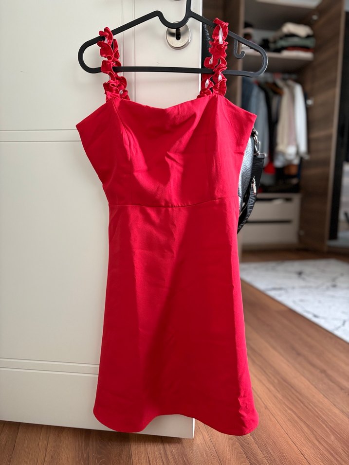 Bu kırmızı, drapeli ve oturan mini elbise, fırfırlı askılarıyla dikkat çeker. Minimalist ve parlak dokusuyla cesur romantik akşamlar için uygundur. ❤️