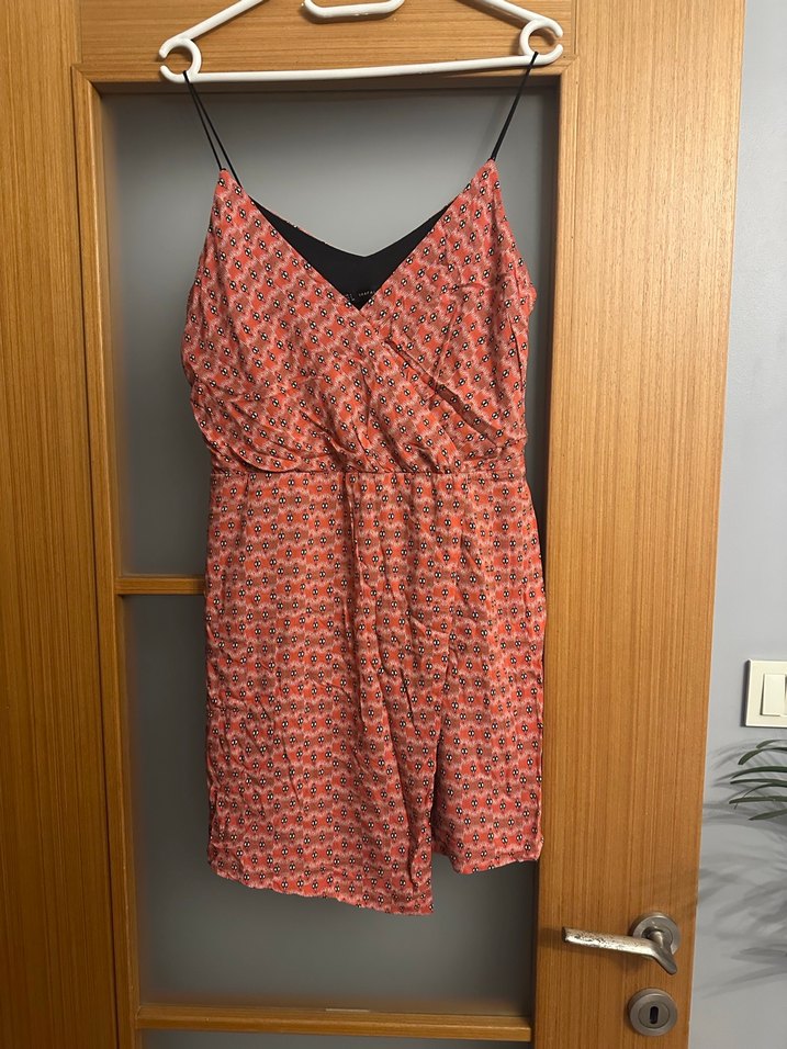 Kırmızı tonlarında bağlama desenli, drapeli ve straplez yaka mini tulum. Sentetik kumaştan, günlük ve sokak stiline uygun.