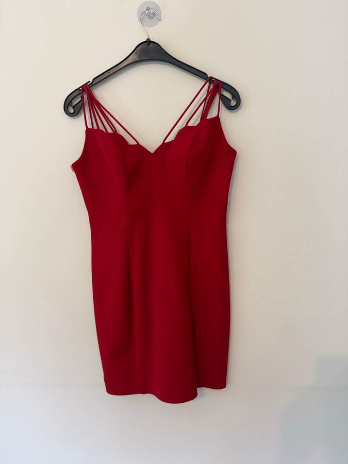 Kırmızı, drapeli detaylı, V yakalı ve ince askılı mini elbise. Sade ve şık tasarımıyla cesur romantik buluşmalar için uygun. ALFABETA markalı, boyu uzundu ben kısalttım, 2 kere giyildi.