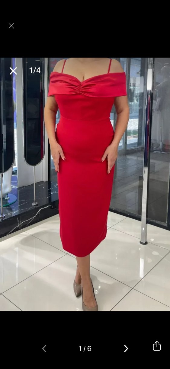 Kırmızı, drapeli ve askılı kollu, tek renkli midi elbise. Tekne yaka ve vücuda oturan kesimiyle modern klasik tarzda, parlak kumaştan yapılmıştır. ❤️ Esnme payı vardır.