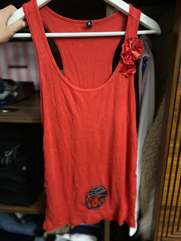 Kırmızı, drapeli ve baskılı desenli, salaş kesim kadın atlet, günlük şık spor tarzı için uygundur.