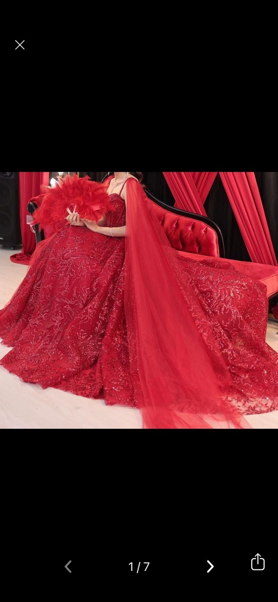 Uzun kesim, straplez yaka ve desenli detaylara sahip kırmızı, drapeli abiye elbise. Şık ve ışıltılı, düğünler için ideal. Kolsuz tasarım.