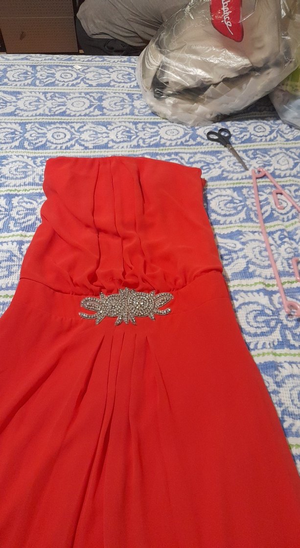 Uzun kırmızı straplez abiye elbise, drapeli ve nakışlı parlak desene sahip. Klasik kesim, kolsuz ve düğünler için uygun.
