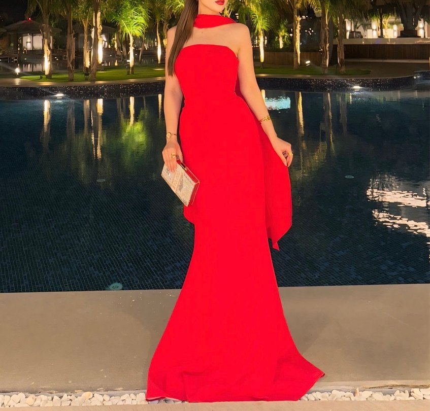 Kırmızı, straplez yaka ve drapeli tasarıma sahip uzun abiye elbise. Regular fit ve kolsuz yapısıyla düğün gibi özel anlara uygundur. Parlak kumaş ve çağdaş stil öne çıkar.
