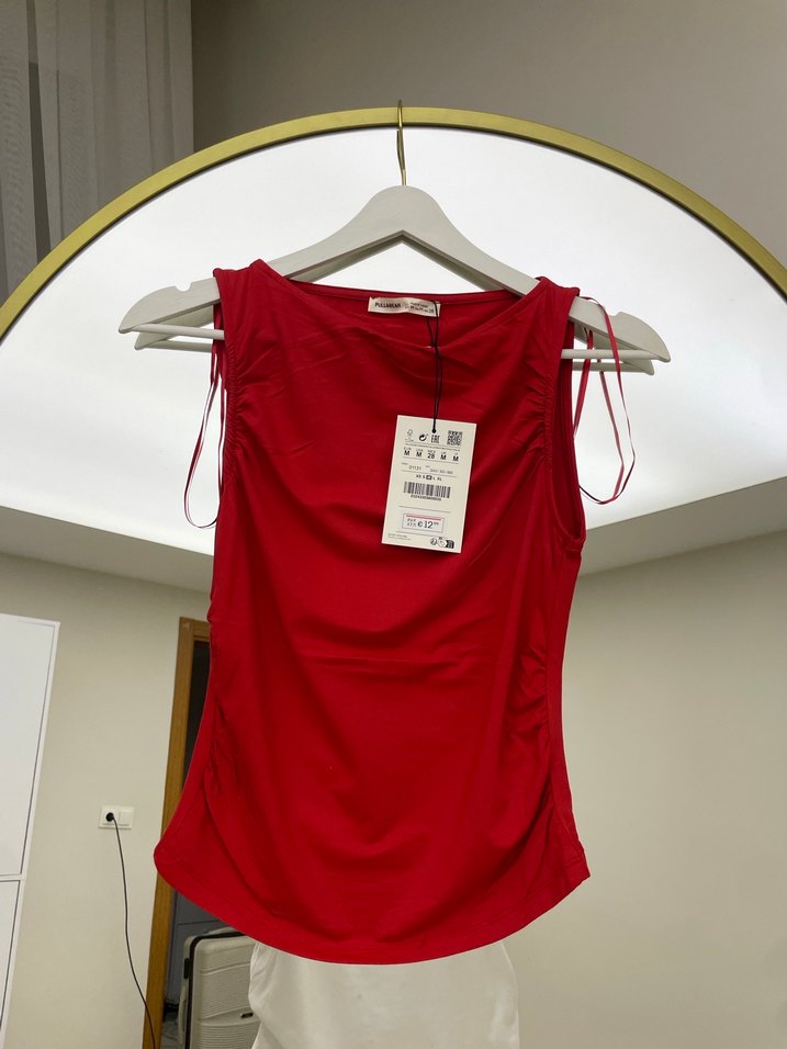 Kırmızı, drapeli ve straplez kesime sahip, sentetik kumaştan üretilmiş kadın atlet. Sokak stili ve athleisure tarzına uygun, günlük kullanıma elverişli.