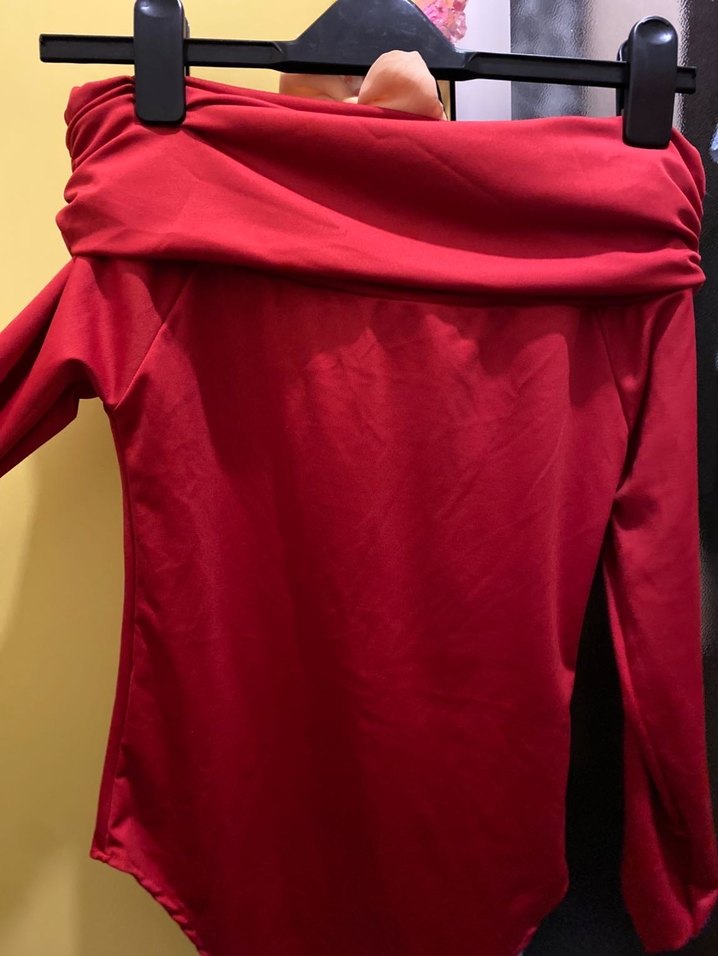 Parlak kırmızı, straplez ve drapeli yakaya sahip uzun kollu, vücuda oturan kadın bluz. Sadece 1 kere giydim kapandığım için satıyorum