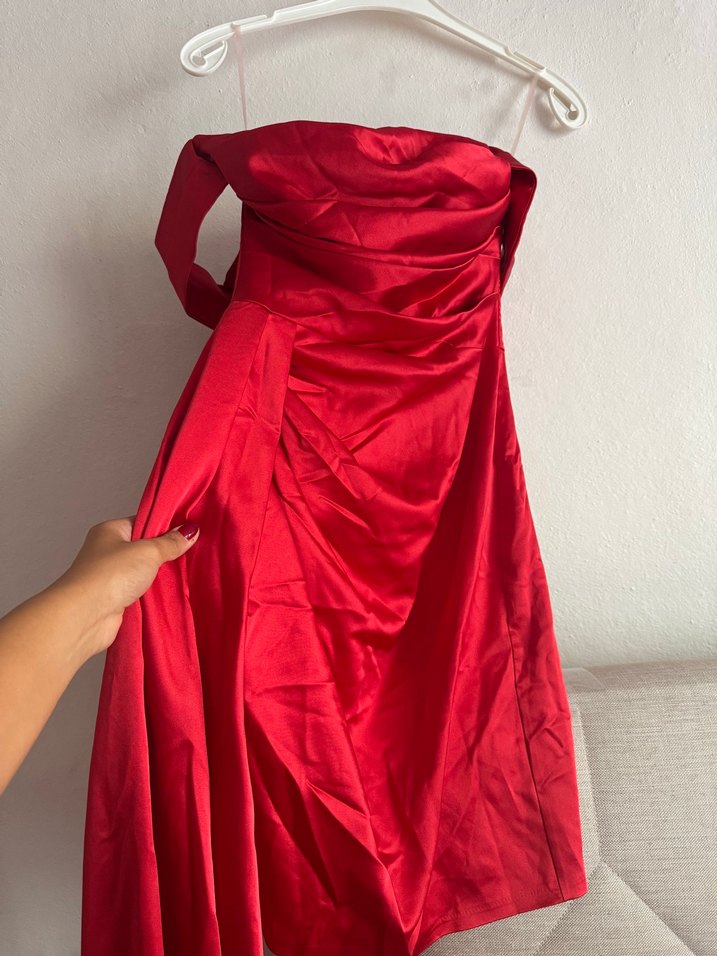 Kırmızı parlak kumaştan, straplez ve drapeli, vücuda oturan midi boy abiye elbise. Modern klasik tarzıyla düğün ve özel etkinlikler için uygun.