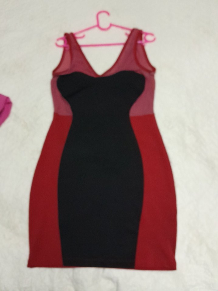 Sentetik kumaştan yapılmış, straplez yakalı ve askılı kolları olan kırmızı drapeli, diz boyu elbise. Gotik tarzda parti için uygun, vücuda oturan kesim.