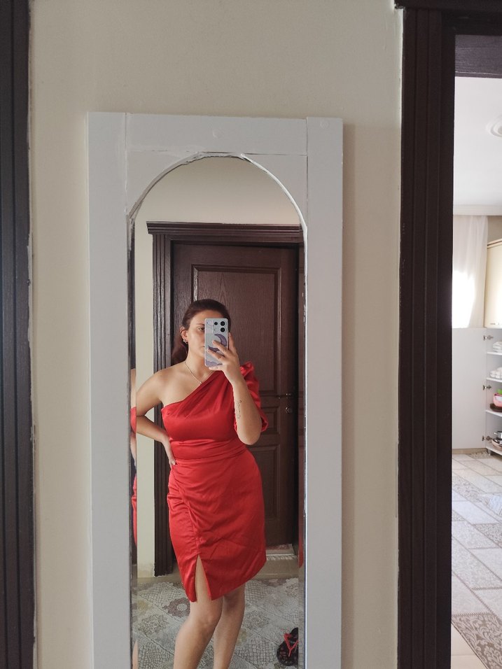 Parlak kırmızı, straplez yakalı ve drapeli detaylı, vücuda oturan midi elbise. Romantik akşamlar için uygun. ❤️ yırtmaçini biraz kapattirdim