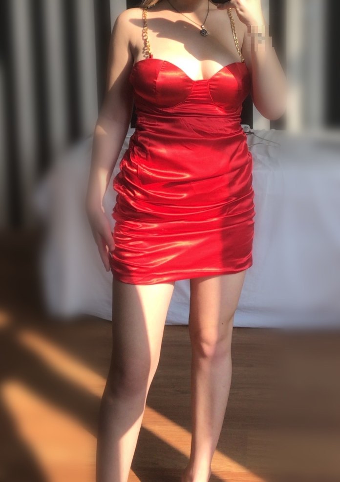 Kırmızı, drapeli ve straplez tasarımlı, saten dokulu mini elbise, gösterişli bir sokak stili için uygundur. Zincir askılı