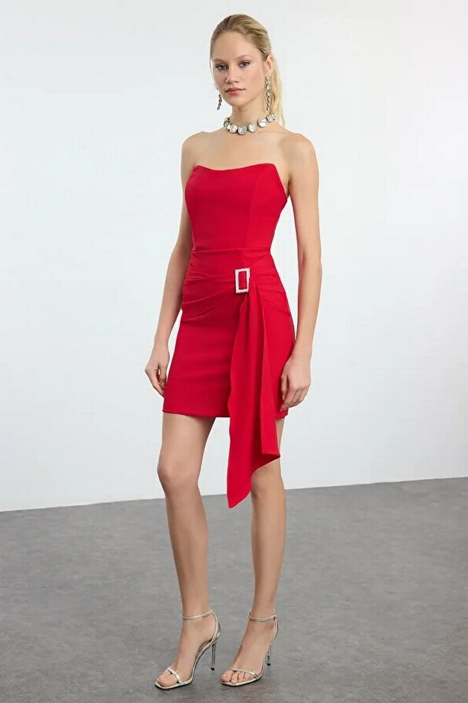 Kırmızı parlak renkte, drapeli ve straplez tasarımlı, vücuda oturan mini gece elbisesi. Çağdaş tarzda, romantik akşamlar için uygundur.