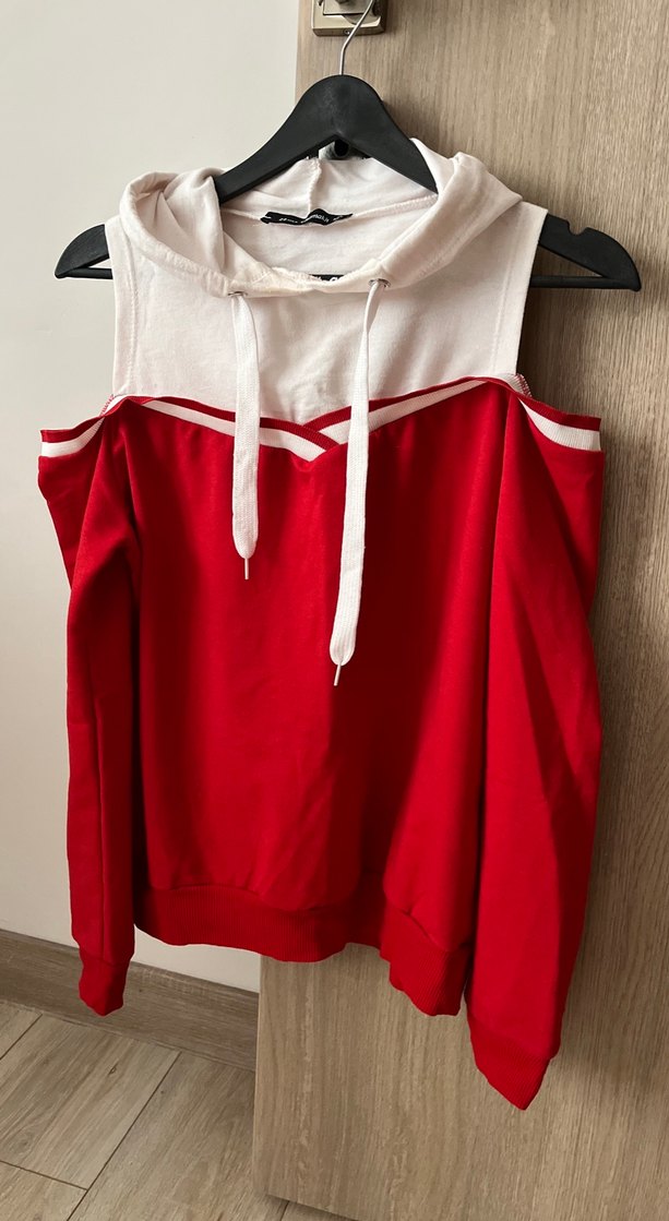 Kırmızı, straplez ve uzun kollu, bol kesim sweatshirt. Drapeli detaylı ve parlak yüzeye sahip, günlük sokak stili için uygun.