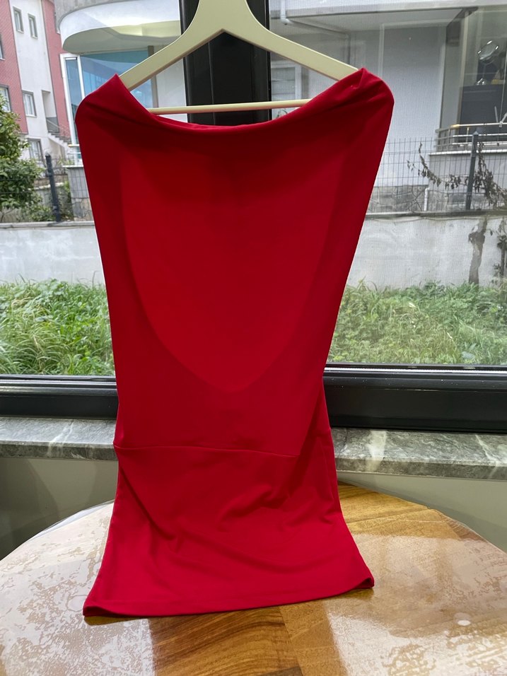 Drapeli ve straplez yakalı, parlak kırmızı sentetik kumaştan yapılmış, vücuda oturan tunik. Kolsuz ve midi boyda, romantik akşamlar için ideal. Modern ve minimalist tarzda.