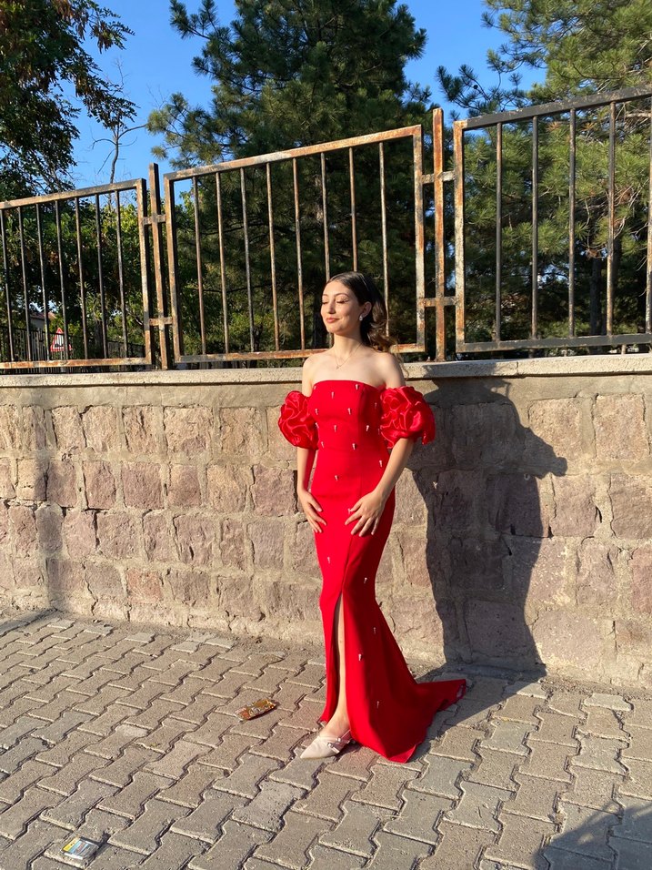 Kırmızı, straplez uzun abiye, parlak dokusuyla düğün ve özel davetler için uygun.