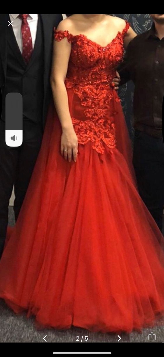 kırmızı desenli, drapeli, straplez ve uzun kesimli bu abiye, modern klasik tarzı ve göz alıcı şıklığı bir araya getirir. 1 kez giyildi arkası ayarlanabilir ipli 38-40 uyumlu tül kısmı çıkarılıp balık abiye olarak ta kullanılabilir tak çıkarlı özel tasarımdır