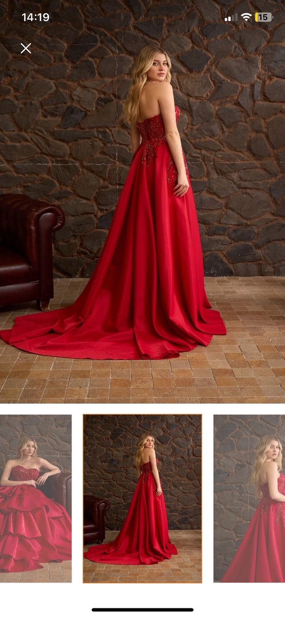 Parlak kırmızı kumaştan, straplez ve drapeli, vücuda oturan uzun abiye elbise. Modern klasik tarzda, düğünler için uygun.