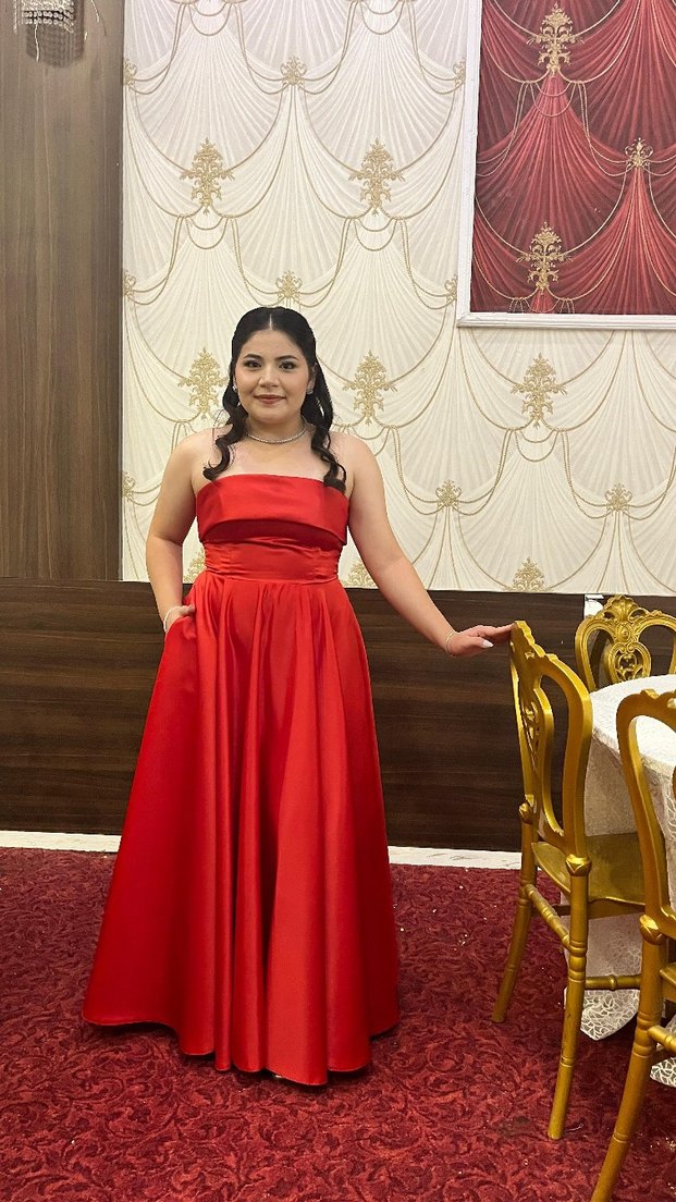 Kırmızı straplez uzun abiye elbise, drapeli ve parlak baskılı kumaşla. sadece ablamın düğününde giydim bir daha giyemiceğim için satıyorum