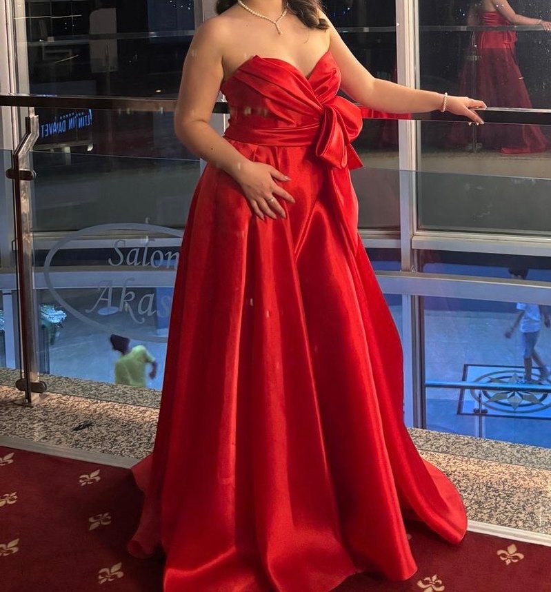 Parlak kırmızı kumaştan, drapeli ve straplez uzun abiye elbise. Modern klasik tarzda, fit kesim ve kolsuz tasarım. Düğün ve özel davetler için uygundur.