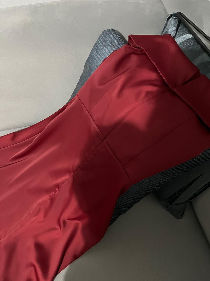 Drapeli ve straplez tasarıma sahip, kırmızı uzun ve vücuda oturan abiye elbise. Çağdaş stilde, kolsuz ve dış mekan etkinlikleri için uygun.