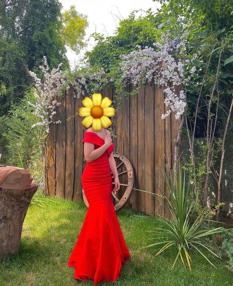 Kırmızı, drapeli ve straplez yakaya sahip uzun, çiçek desenli, bohem ve avangart tarzı abiye elbisedir.