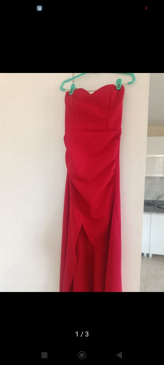 Kırmızı, straplez yakalı, drapeli ve uzun boylu bu abiye elbise, şık ve minimal bir tarz sunar. Düğünler için uygundur.