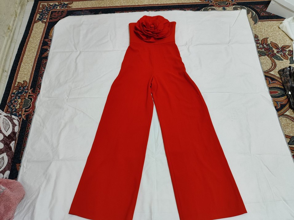 önündeki koca gül çıkarılabilir takılabilir Kırmızı, straplez uzun tulum, vücuda oturan kesimi ve yakadaki drapeli detayla dikkat çeker. Pürüzsüz sentetik kumaştan yapılmıştır, minimalist ve avangart tarzlar için uygundur. Kolsuz ve desensiz, renkli bir şıklık sunar.