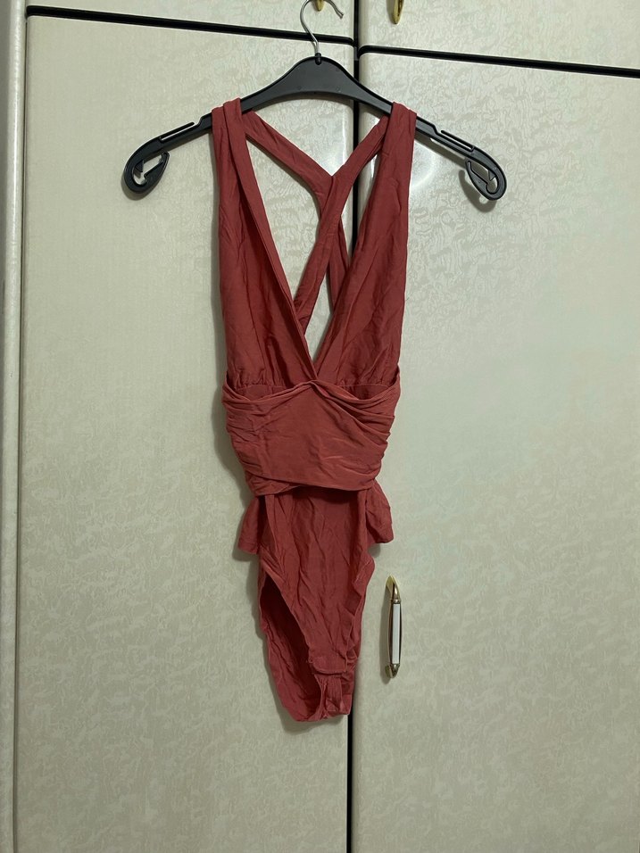 Kırmızı renkte, drapeli detaylı ve askılı kısa mayo, bohem ve avangart tarz sunar, plaj için uygundur.