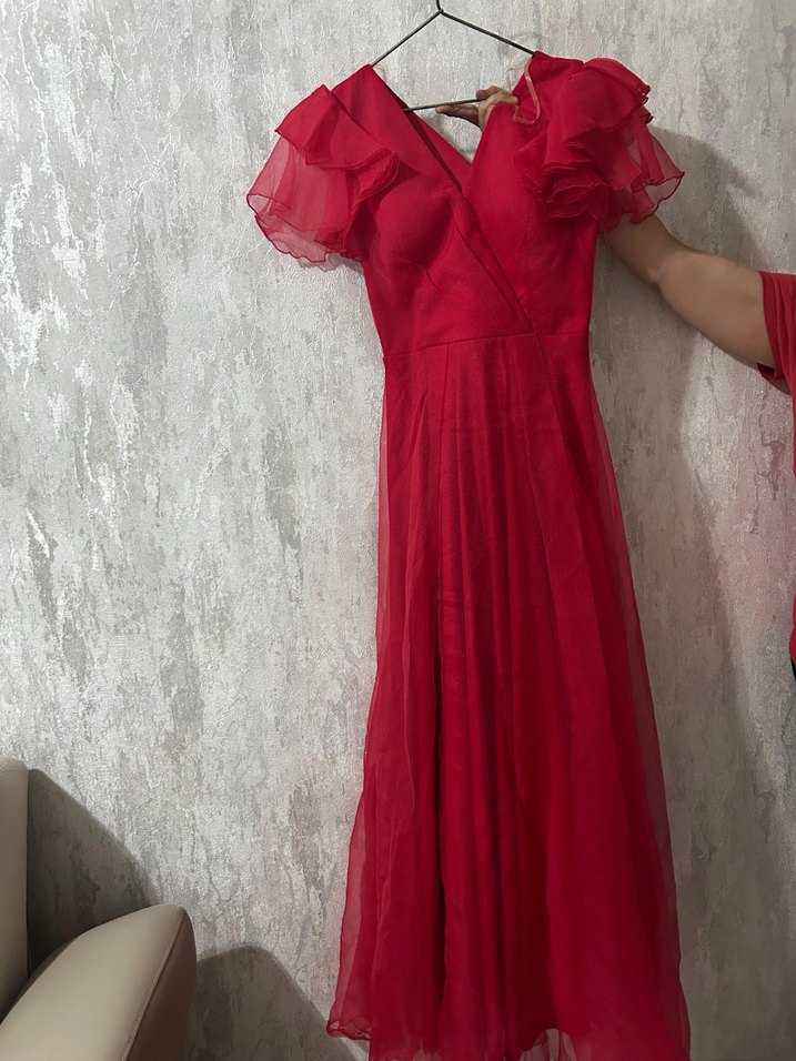 Parlak kırmızı renkte, V yakalı ve drapeli detaylara sahip uzun, dar kesim abiye elbise. Kısa, tül görünümlü kabarık kollu, modern klasik tarzda, düğünler için uygun. İki düğünde giydim, uzun geldiği için biraz süründü ondan dolayı yıpranması var. Göğüsü kısmını da iğnelemiştim. Hafif bir deformesi var onun dışında tertemiz ve rengi harika bir kırmıızı