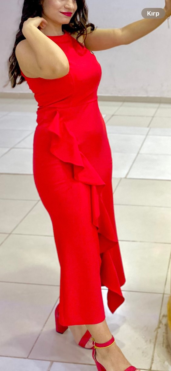 Kırmızı Drapeli Uzun Abiye Elbise